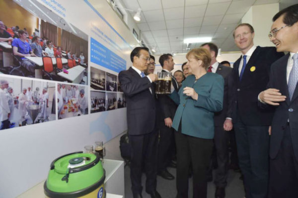 30日上午,李克强总理与德国总理默克尔在合肥学院食品专业交流合作展区共同品尝世俱杯学生酿制的德国黑啤。(中国新闻网 人民网消息)