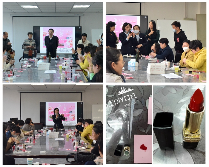 另一边的37栋305教室,指导老师正在给女教工们介绍口红制作步骤和注意事项。大家精心调配颜色、将原材料按照比例搅拌均匀、加热上色、倒入模具中冷却成型,最终脱模装进口红管里。当一包包原材料变成一支支精美的口红,每位女职工脸上都洋溢着幸福和喜悦。
