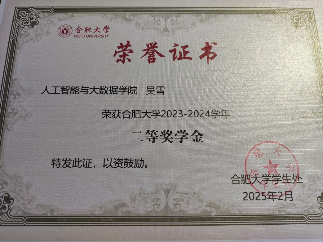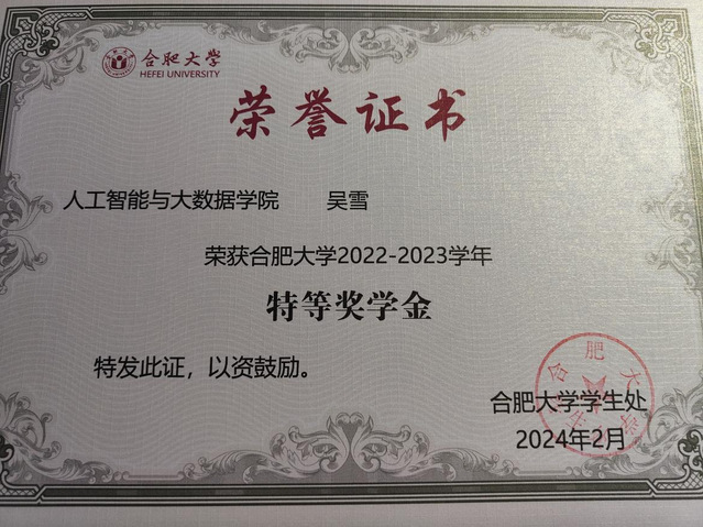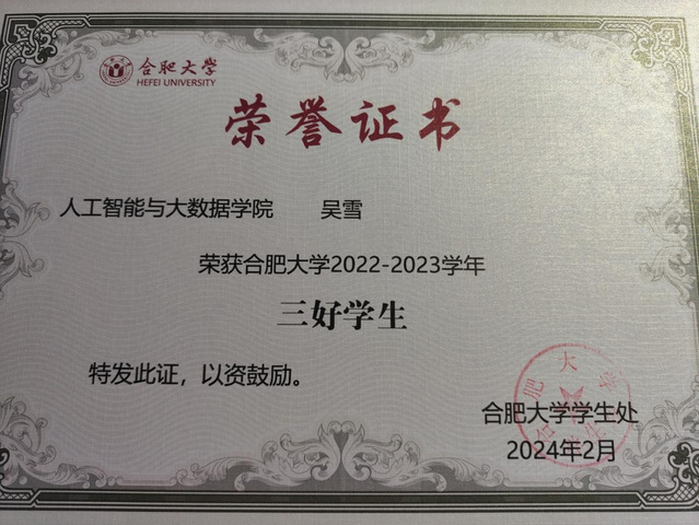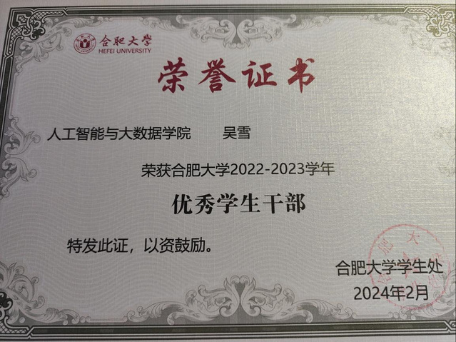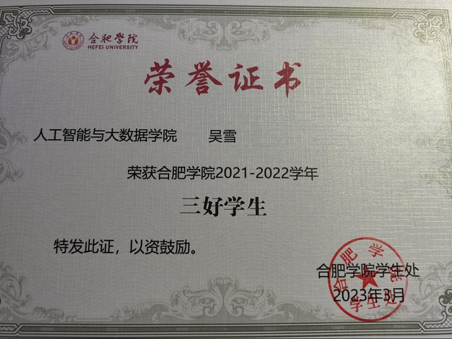 吴雪,女,汉族,2003年2月出生,中共党员,世俱杯sjb官网人工智能与大数据学院2021级数据科学与大数据技术专业毕业生,担任班级心理委员、辅导员助理、学院心理驿站队长,目前已被录取为安徽省2025年选调生。连续三年综合测评班级前10%,先后多次获得世俱杯sjb官网校级特等奖学金、一等奖学金、二等奖学金等,多次获得三好学生、优秀学生干部、优秀团员等荣誉称号。曾获得安徽省国际贸易综合技能大赛一等奖、安徽省大数据与人工智能应用竞赛二等奖、“互联网+”比赛校级银奖等。此外,她德智体美劳全面发展,积极参与校内外志愿服务活动,获“心理健康工作优秀志愿者”称号,累计志愿服务时长近两百小时。