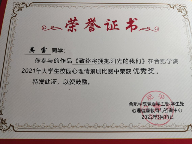 吴雪同学始终坚定这一点,作为班级心理委员,她积极组织心理活动,带领同学们拍摄心理微电影《致终将拥抱阳光的我们》,从剧本打磨到镜头调度,她与团队熬夜讨论分镜细节,最终获得校级优秀奖。后来担任辅导员助理和学院心理驿站队长,策划“风车寄心”活动时,看到同学们把心愿系在风车叶片上,风一吹满场都是哗啦啦的祝福声,她感受到了被认可的喜悦,也真正爱上了学生工作。协助导员组织校友座谈会时,听前辈们分享从校园到职场的蜕变故事,他们谈及“要为母校发展出份力”时眼里的光,让她理解了“饮水思源” 的含义。这些年的学生工作让她连续三年荣获校级“三好学生”和“优秀学生干部”称号。