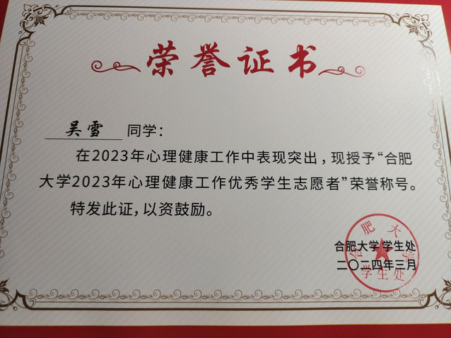“赠人玫瑰的指尖,永远留着芬芳。”吴雪的志愿服务轨迹如星子散落:大一时她参加校大学生寒假社会实践获优秀团队三等奖,在县博物馆当志愿者时被小朋友追着喊 “姐姐下次还来”,还在校获得“心理健康工作优秀志愿者”称号。尤其在博物馆讲解家乡文物时,她意识到奉献的意义不仅是付出,更是让自己成为连接他人与美好的纽带。这些志愿服务经历像珍珠般串起她的大学时光,让她与世界温柔相拥。