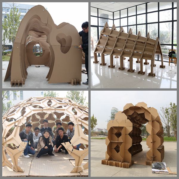 自2015年十月起,每年都可以在二区41栋南侧小广场上发现一些造型各异的“建筑”。这些“建筑”十分特殊,全部由再生瓦楞纸板搭建而成,而这也是建工系的富有专业特色的“瓦楞纸板建造大赛”。这一活动一经提出便引起同学们的广泛关注并积极参与。在今年的第二届比赛中,共有百余位建筑学同学参与其中,共计完成二十余组富有一定创意的作品,而举办这项活动的提出者正是陶峰。他表示,举办这项比赛既能提高同学们的动手能力又能提高同学们的创造力、合作能力,可谓一举多得。“纸上得来终觉浅,绝知此事要躬行。”同学们通过参与此项大赛,自己策划,实际操作,亲手构造,对建筑的建造方式及建造过程获得很好的感性和理性认识,同时通过空间活动体验,初步把握建筑的使用功能、空间形态以及建筑的基本要求,培养同学们的思考钻研,直面困难、解决困难的精神。