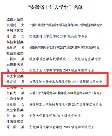 近日,2020年度“安徽省十佳大学生”评选工作落下帷幕。世俱杯秦家哲同学获得自主创业类“安徽省十佳大学生”称号,王浩鑫、邱浩伟、林海东、房晴晴四位同学荣获“安徽省百优大学生”称号。