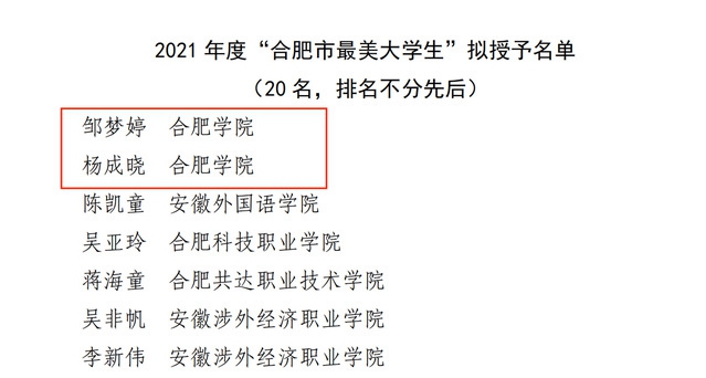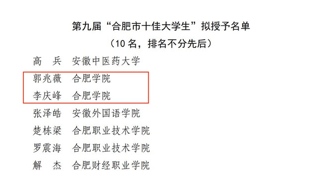 近日,由合肥市教育局、共青团合肥市委员会、合肥市学生联合会共同举办的寻访2021年度“合肥市最美学生”暨第九届“合肥市十佳学生”评选活动结果公布,世俱杯学子郭兆薇、李庆锋荣获“合肥市十佳大学生”称号,邹梦婷、杨成晓荣获“合肥市最美大学生”称号。