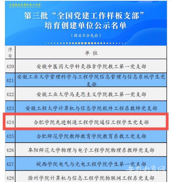 近日,教育部思想政治工作司公布关于第三批新时代高校党建示范创建和质量创优工作评审结果,此次遴选共产生了11个全国党建工作示范高校、100个全国党建工作标杆院系、1000个全国党建工作样板支部培育创建单位。合肥学院先进制造工程学院通信工程学生党支部成功入选第三批“全国党建工作样板支部”培育创建单位。