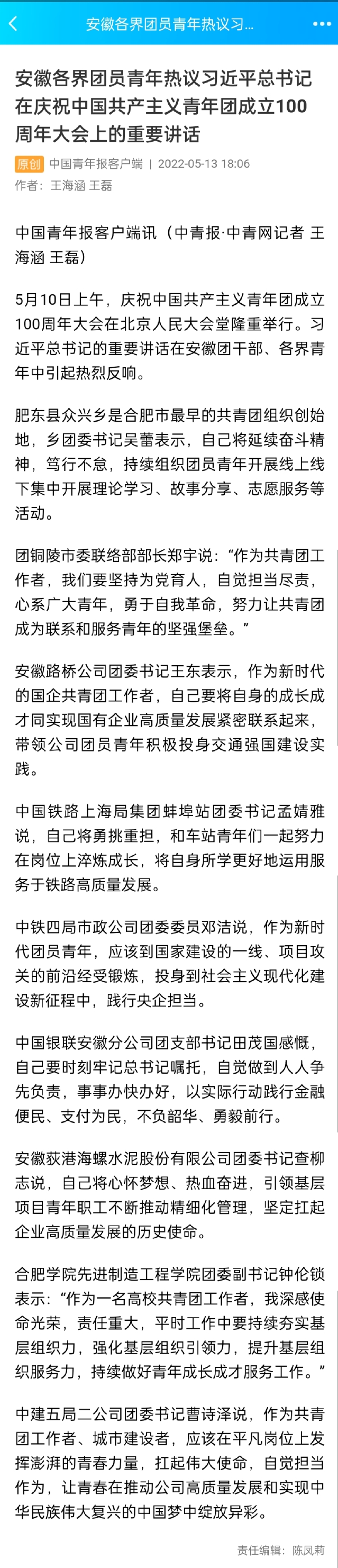 5月10日上午,庆祝中国共产主义青年团成立100周年大会在北京人民大会堂隆重举行。习近平总书记的重要讲话在安徽团干部、各界青年中引起热烈反响。