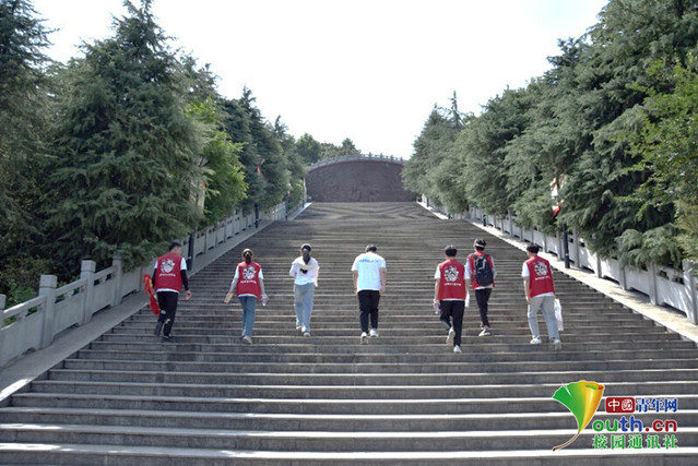 图为调研团队成员正走在代表着金寨这块红色的土地上走出的59位开国将军的59级台阶上 中国青年网通讯员 江晨阳 摄