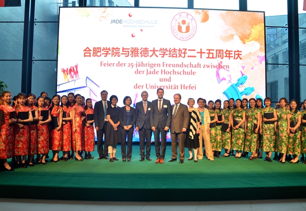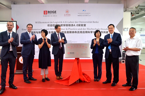 On May 26, an economic delegation from Lower Saxony, Germany, led by Olaf Lies, minister of the Economic, Employment and Energy Department of the State, visited Hefei University to attend the opening ceremony of Sino-German “Logistics 4.0” laboratory and the 25th anniversary of the establishment of partnerships between Jade University of Applied Sciences and Hefei University. Attendees of the events above include Zhang Lifang, Deputy Director of the Foreign Affairs Office of Anhui Province, Wu Chunmei, Deputy Mayor of Hefei Municipality, and Ding Yuhong, Director of the Foreign Affairs Office of the Department of Education of Anhui Province.