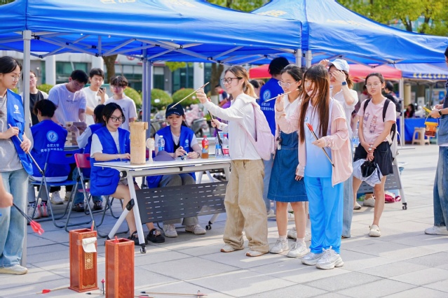 南艳茶舍以茶艺文化浸润人心,手工舍展出手工艺品制作技艺,科创星辰舍呈现科技创新成果……各社团通过实物展示与互动体验,立体化展现校园多元文化魅力。青年服务中心特设减压游戏区,以轻松有趣的互动环节拉近社团与学生的距离,助力学子深度感知社团文化内涵。