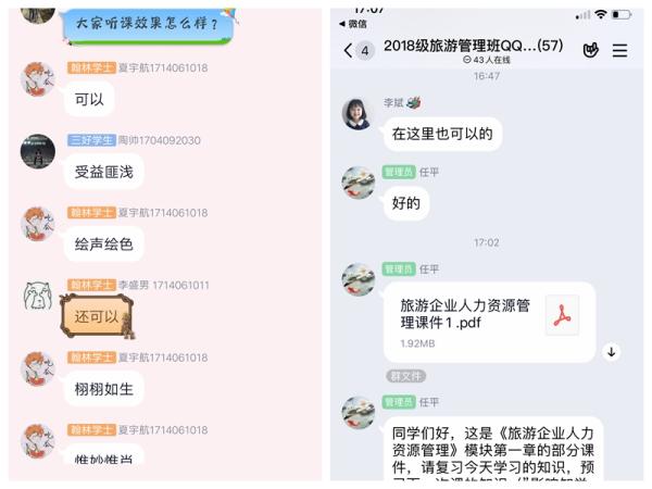 老师们纷纷表示,这么多天的准备,收获了满满的感动,克服重重困难与可爱的学生们网上相聚,同事们互相帮助攻克难关,学校和学院不遗余力做我们的坚强后盾,自己将继续努力,总结经验,以最饱满的精神状态上好每一堂课。同学们在朋友圈中写道:人生第一次在线上课,感觉不错。准时出现在网上的虚拟教室里,仿佛就跟平时来到教室一样,虽然没有铃声,但心中有学校的召唤。