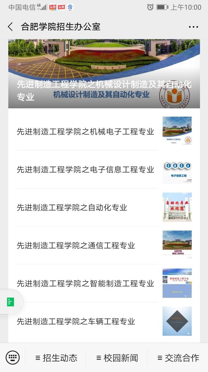 校微信公众号影响力持续提升。贯穿学校近三年办学成果,合肥学院招生办微信公众号陆续发布学院简介和专业简介系列主题推送40余篇,全面直观地介绍了学院专业的师资队伍、学生活动和教学科研成果等内容,为关注学院专业发展和有意报考的考生提供了全方位的信息服务。