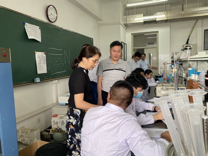 检查期间,正值返校本科生上实验课。陈秀随堂听课,与任课教师、学生互动交流,了解实验课开展状况,并叮嘱要注意实验安全与卫生,特别要规范危险化学品的储存、使用,遵守实验室安全制度。